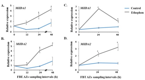qRT-PCR analyses were next carried out using control and ethephon-treated fruitlet AZs, collected at different time points prior to the documentation of abscission rate peaks. Figure 3A,B show that in FBEs, MiIDAs transcript accumulation increased following ethephon treatment, and became significantly higher than what was noted in controls within 12 and 24 h for MiIDA2 and MiIDA1,, respectively. The parallel analysis of FBT pedicel AZs showed that over the examined period, the levels of both MiIDAs barely increased in control trees (Figure 3C,D). However, following ethephon treatment, MiIDA1 sharply and significantly increased after 24 h, and then decreased to some extent after 48 h (Figure 3C), while MiIDA2 transcription exhibited a marked pattern of upregulation starting within 24 h of ethephon treatment (Figure 3D).