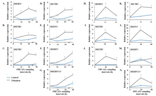 Ethylene is perceived through its binding to its receptors, which act as negative regulators [38,39,40]. As mentioned above, the expression profiles of MiERS1 and MiETR1 ethylene receptors were previously characterized during mango fruitlet drop [31,32,33]. Here, we expanded these studies to examine the effect of ethephon treatment on the expression profiles of additional ethylene signaling-related genes in fruitlet AZs. The corresponding cDNA samples were used to monitor the expression profiles of genes encoding for the ETR2-type ethylene receptor, for the CTR1 kinase, that acts downstream of the ethylene receptors, for the EIN3 ethylene regulator, and for two ethylene responsive factors (ERFs). The expression analyses showed that the ethephon treatment upregulated and/or transiently induced MiERS1 and MiETR1 expression within 12–48 h in the AZs of FBE (Figure 4A,B) and FBT (Figure 4H,I), compared to their low expression levels in control tissues. Notably, however, in control FBE AZs, their levels initially slightly decreased and then increased back, whereas in FBT AZs, their levels moderately increased within 24 h. With respect to MiETR2 (Figure 4C,J), MiCTR1 (Figure 4D,K), and MiEIN3 (Figure 4E,L), the AZs assay results showed similar rapid and strong ethephon-induction patterns for the three genes in both systems. Finally, when comparing the two MiERF transcripts examined, the expression analysis showed that MiERF3 and MiERF113 levels were significantly induced by ethephon within 12–24 h in FBE AZs (Figure 4F,G). On the other hand, in FBT AZs, only MiERF113 level was significantly induced by ethephon within 24 h and declined later on (Figure 4N).
