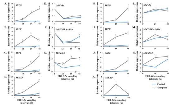 Effect of ethephon treatment on the expression profiles of seven genes encoding for distinct cell wall-modifying proteins in mango fruitlet AZs of FBE (A–G) and FBT (H–N) during 48 h. The analysis of qRT-PCR was performed using cDNA prepared from total RNA extracted from FBE or FBT AZs. Values represent relative expression levels normalized against the endogenous reference gene, MiGAPDH. For each group and time point, the data are presented as the means ± SE of three independent biological replicates, and two technical replicates. Asterisks (*) denote significant differences between ethephon-treated and control AZ samples at each sampling point (p ≤ 0.05).