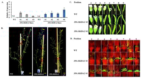 For constitutive expression of the two MiIDA genes in Arabidopsis, the plasmid pART7-based pART27 vector was used. The protein-coding regions of MiDA1 and MiIDA2 were first amplified using the MiIDA1/MiIDA2-XhoI and MiIDA1/MiIDA2-XbaI primers (Supplementary Table S1). The purified PCR fragments were digested with XhoI and XbaI, respectively, and cloned into the XhoI-XbaI site of the pART7 vector between the 35ScaMV promoter and the ocs 3’ transcription terminator. The expression cassettes were next NotI-excised from the pART7 constructs, and inserted into the binary plant transformation vector, pART27. The resulting plasmids, named pART27 35S:MiIDA1 and pART27 35S:MiIDA2, were further used for stable transformation of wild type (WT) (Col-0) Arabidopsis plants using the Agrobacterium tumefaciens-mediated floral dip method [36]. The transformed seeds were selected on medium containing half-strength Murashige and Skoog salts and kanamycin (50 µg/mL). For complementation purposes, an Atida T-DNA insertion line, prepared by the Salk Institute Genomic Analysis Laboratory, was obtained from the Nottingham Arabidopsis Stock Centre (NASC). The (SALK_133209.24.65.x) line in a Col-0 background contains a T-DNA insert in the 5′UTR region 6 bp upstream of the translation start codon. Before attempting complementation, the homozygosity of the Atida T-DNA insertion plants was confirmed using forward 5’ UTR region, and reverse from 3′ left border repeats primers (Supplementary Table S1). The pART27 35S:MiIDA1 and pART27 35S:MiIDA2 constructs were further used for stable transformation of the Atida mutant, as described above. Seven and nine independent randomly selected PCR-positive kanamycin-resistant plants obtained (35S:MiIDAs and Atida 35S:C_MiIDAs, respectively), were self-pollinated (F2 progeny), and plants from the second generation of overexpressing, and/or complemented MiIDAs lines were further used for phenotypic assessment. All plants were grown in a growth room under a long day regime (25 °C, 16/8 h light/dark). To confirm MiIDA expression in the transformed plants, total RNA was isolated from the leaves of MiIDA-overexpressing, and/or from MiIDA-complemented plants, using a Plant/Fungi Total RNA Isolation Kit (Norgen Biotekcrop, Thorold, ON, Canada). First strand cDNA was generated, and the accumulation of MiIDA genes was evaluated by RT-PCR, using Fast SYBR Green Master Mix (Applied Biosystems, Foster City, CA, USA). Reactions were carried out using 3 µL of the cDNA products (1:10 dilution), 6 μL of SYBR Green PCR Master mix, and 200 nM primers from the relevant primer pair in a final volume of 12 µL. Analysis was performed with a One Step One Plus Real Time machine (Applied Biosystems). cDNA samples were analyzed in triplicates. Transcript levels in each sample were estimated using a standard curve for each gene, normalized against the AtACT transcript level. Relative expression (RE) levels were calculated by dividing each individual gene copy number by the AtACT copy number. For phenotypic characterization, plant heights and siliques lengths (mm) were measured. Flowers and siliques from positions 2 to 9 along inflorescences of WT, MiIDA-overexpressing, and MiIDAs complemented plants were removed from the plant bodies and imaged using a Binocular (Leica MZFL III) equipped with a Nikon Digital sight camera (DS-Fi1, Japan). All measurements were performed with 3 or 4 biological replicates.