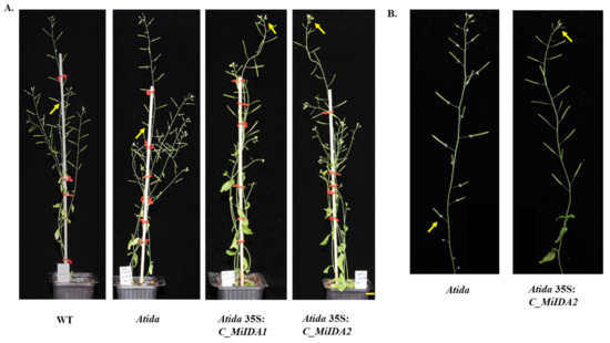 MiIDA1 and MiIDA2, expressed under control of the 35S promoter, complemented and restored floral organ abscission ability in an Atida mutant. Phenotypes of fully developed WT, Atida mutant, Atida 35S:C_MiIDA1- and Atida 35S:C_MiIDA2-complemented plants (A), and enlarged photos of the Atida mutant and Atida 35S:C_MiIDA2-complemented plants (B), are presented. Scale bar = 1 cm. Arrows denote attached floral parts.