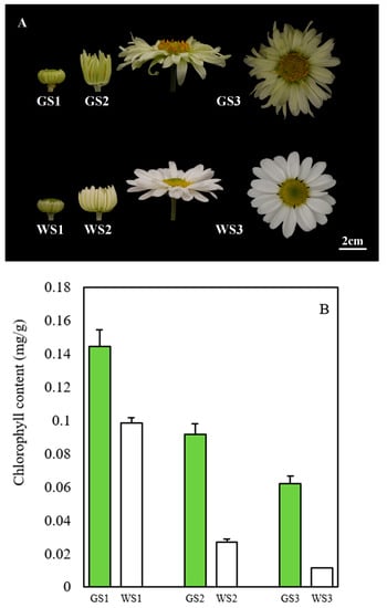 Phenotype and chlorophyll accumulation at three stages of flower development. (A) Floret color at each stage of flower development. (B) Chlorophyll content of petals from green and white pools at each stage.