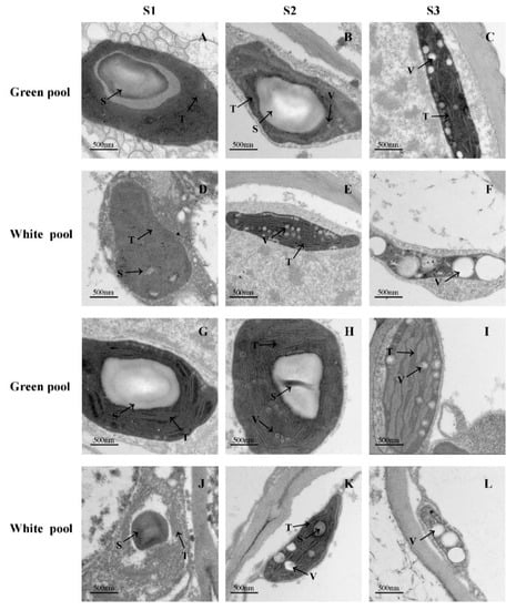 TEM images of plastid ultrastructure. (A–C,G–I) Plastid ultrastructure in the epidermal cells (A–F) and mesophyll cells (G–L) of ray florets of green (A–C,G–I) and white (D–F,J–L) pools. S, starch granule; T, thylakoids; V, lipid vesicles.