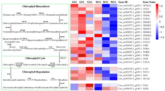 Expression heatmap of DEGs involved in chlorophyll metabolism in different samples.