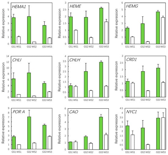 As chlorophyll content directly influences flower color, we screened the unigenes in order to identify those related to chlorophyll metabolism. Of the 113 candidates, 24 were DEGs (Table 2). All of the DEGs related to chlorophyll biosynthesis were more highly expressed in green as compared to white pools (Figure 4); this was confirmed by qRT-PCR analysis, which also showed that the differences in gene expression levels were similar at each stage of flower development (Figure 5).