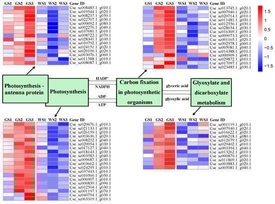 We identified 650 genes related to photosynthesis (i.e., the “Photosynthesis”, “Photosynthesis—antenna proteins”, “Carbon fixation in photosynthetic organisms”, and “Glyoxylate and dicarboxylate metabolism” KEGG pathways), of which 63 were identified as DEGs (Table 2). All of the DEGs related to photosynthesis were more highly expressed in green pools as compared to white pools (Figure 6), and their expression levels increased during flower development in the former, but not in white pools. These results indicate that the difference in flower color between green and white pools is caused by the differential expression of genes involved in chlorophyll metabolism as well as those related to photosynthesis.