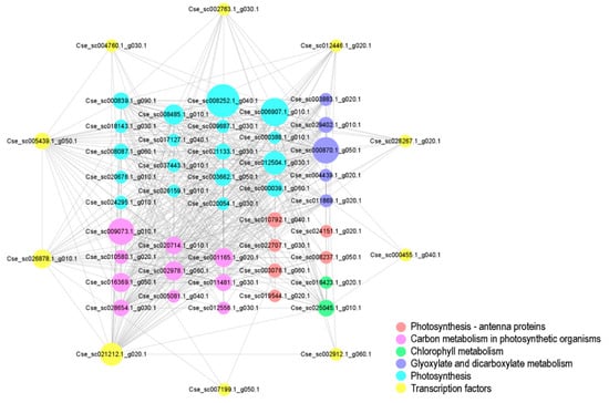 We selected genes that showed significant enrichment in key pathways and TF genes in the same module to construct a gene regulatory network to identify the hub TFs in the network. In this module, 2741 edges were created. We selected the top 500 edges by their weight value to construct the network, which contained 51 node genes (Figure 8). The network included 6 genes related to Photosynthesis—antenna proteins, 10 related to Carbon metabolism, 5 related to Glyoxylate and dicarboxylate metabolism, 18 related to Photosynthesis, 2 related to Chlorophyll metabolism, and 10 TFs belonging to 7 TF families (ERF, n = 3; COL, n = 2; C2H2, n = 2; APETALA2 (AP2), n = 1; M-type MCM1, AGAMOUS, DEFICIENS, and serum response factor (MADS), n = 1; basic leucine zipper (b-ZIP), n = 1; and NUCLEAR TRANSCRIPTION FACTOR Y SUBUNIT BETA (NFYB), n = 1). Two COL (Cse_sc021212.1_g020.1 and Cse_sc026878.1_g010.1) TFs and one ERF (Cse_sc005439.1_g050.1) TF with the highest connectivity were identified as hub TFs in the network.
