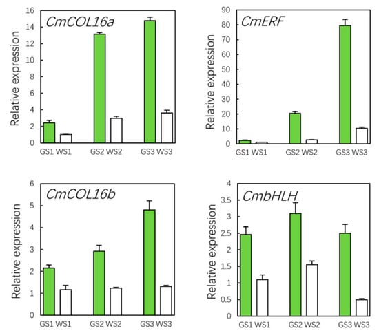 According to the color of the ray florets of the green pools and the white pools at different stages, we screened 6 TFs by expression analysis and 11 TFs by WGCNA, respectively; three TFs were in common. In addition, in the six TFs screened by differential expression analysis, the TF (Cse_sc007092.1_g020.1) belonging to the bHLH family also showed a similar expression pattern to the phenotype, so we chose these four TFs for further analysis: two were COL family members and were named CmCOLa (Cse_sc021212.1_g020.1) and CmCOLb (Cse_sc026878.1_g010.1), and the other two were ERF (CmERF; Cse_sc005439.1_g050.1) and bHLH (CmbHLH; Cse_sc007092.1_g020.1) TFs. The results of the qRT-PCR analysis showed that all of the genes had a higher expression in green as compared to white pools at each flower development stage (Figure 9). We also compared the expression of CmCOL16a, CmCOL16b, CmERF, and CmbHLH (Figure 10A) and measured chlorophyll contents (Figure 10B) in three green and three white commercial chrysanthemum cultivars at S3. CmCOL16b and CmbHLH were expressed at lower levels in florets of all three white cultivars compare with the green cultivars, while CmCOL16a and CmERF showed lower expression in florets of some white cultivars compared to the green cultivars (Figure 10C). Thus, these four genes are key TFs regulating the green flower color in chrysanthemum.