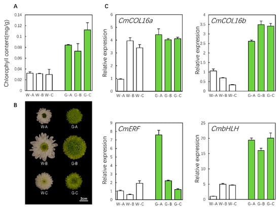 Chlorophyll metabolism is affected by plant developmental stage, light and hormone levels, and other factors. Abscisic acid and dark treatment were shown to accelerate chlorophyll degradation, while exogenous application of melatonin reduced the expression of genes associated with chlorophyll catabolism []. Moreover, chlorophyll content decreased during the development of plant organs [,]. Under heat stress, overexpression of SUPPRESSOR OF OVEREXPRESSION OF CONSTANS 1 (SOC1) and SOC1-like transcription factors (TFs) led to upregulation of chlorophyll biosynthesis-related genes and induced chloroplast biogenesis and the formation of green flower petals in Nicotiana tabacum and Arabidopsis thaliana []. Genes encoding myeloblastosis113 (MYB113), CONSTANS-like 16 (COL16), and ethylene response factor (ERF), whose expression is closely correlated with chlorophyll content, were identified in chrysanthemum [], but the functions of these genes in the formation of green petals in chrysanthemum have not yet been reported.
