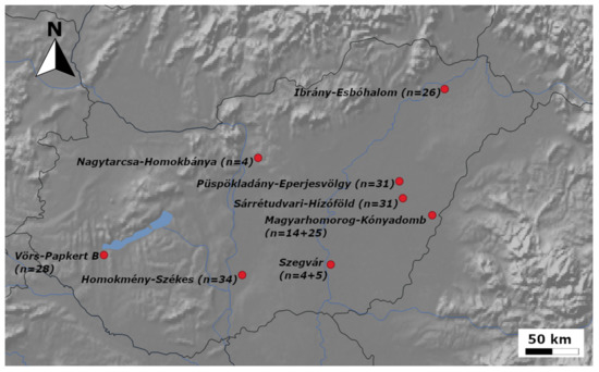 István Bóna attempted to reinterpret the 10–11th century cemeteries by distinguishing two types of cemeteries [45]. The so-called military cemeteries were characterized by the rather low number of graves covering one or two generations and often showing a male surplus, which he considered were mostly used in the first half of the 10th century, while the larger village cemeteries with 30–100 graves were used later, during the 10–12th centuries.