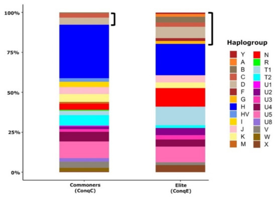 The overall Hg composition of the commoner population proved to be significantly different from that of the elite with respect to both east and West Eurasian Hgs, indicating that these two groups likely had different origins. Population genetic analysis definitely clustered ConqC primarily with European and Near Eastern populations, separating them from the elite, suggesting that people with local European origin dominated the ConqC population.