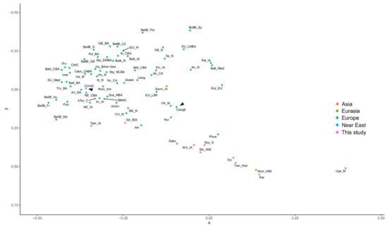 Three independent methods were applied to measure the genetic distances of ConqC from other ancient populations. In the first analysis, we reduced the Hg assignments of all samples to major Hgs, which decreased population data to 34 dimensions, which is sufficient to display the main correlations. Then, major Hg frequencies were calculated and principal component analysis (PCA) was conducted, employing the function “prcomp” in R 3.6.3. [32]. We also compared the major Hg frequencies of the ConqC and ConqE groups separately.