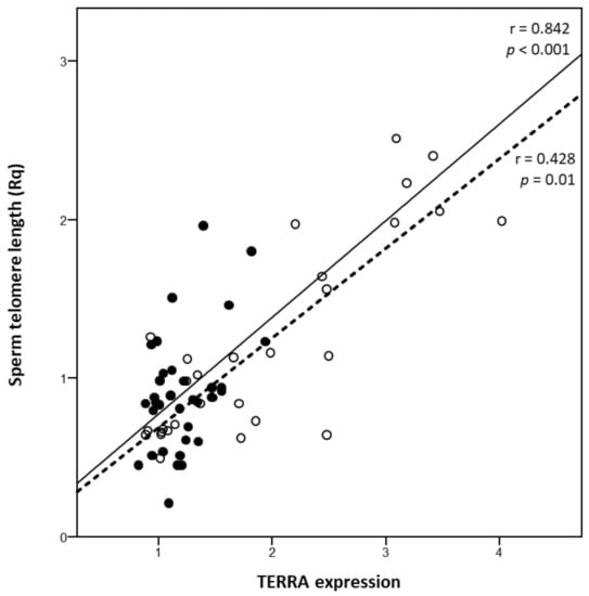 Correlation between sperm TERRA expression and sperm telomere length (STL) in ART patients (full circles) and controls (empty circles, dashed line). STL is expressed as Telomere/Single-copy gene ratio (T/S).