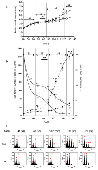 Our cytofluorimetric analysis indicated that in S1 and S2, the composition of cell populations, in terms of DNA content, was similar between the two genotypes, although the cell volume in FAN fruits was already significantly higher than that observed in SR (Figure 1b). Later on, the progressive increase of cell proportion undergoing 4–5 endocycles was occurring only in S3 and S4 FAN fruit, suggesting that endoreduplication may be associated to the higher volume registered in FAN fruit (Figure 1b).