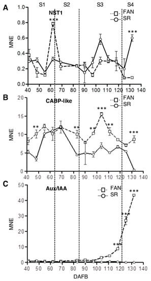 The expression of NO SECONDARY WALL THICKENING (NST1, Prupe.5G131900), the endocarp marker gene, showed a peculiar trend in SR mainly during S1/S2 transition stage and in the middle of S3 phase. In fact, while in FAN fruit the transcript level of NST1 reached its maximum around 60 DAFB, and then it remained at lower constant level for the entire fruit growth, in SR NST1, the peak of the transcript was detected at 104 DAFB in S3 and then the transcript level increased again during S4 stage (Figure 4A). The expression of Prupe.5G117500, which encodes for a putative endoplasmic reticulum-located, histidine-rich, Ca2+ binding protein (CABP-like), had a maximum in FAN at S3 (104 DAFB), while expression levels were much lower in the previous and following stages. In SR, the accumulation of SP transcripts steadily increased during the early phases up to a maximum at S2, but the peak observed in FAN during S3 was not detected in SR (Figure 4B). S4 stage is clearly identified by the expression of Prupe.8G232200 coding for an Aux/IAA protein. In FAN, its expression began to increase from S3 stage (104 and 111 DAFB) to reach a maximum at the end of growth. Differently, in SR it was almost undetectable in all developmental phases (Figure 4C).
