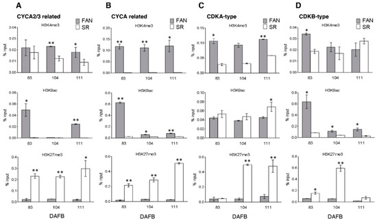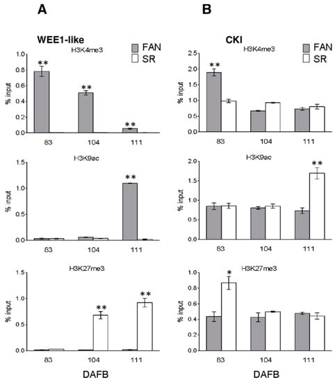 For the CYCA2/3 locus (Prupe.3G075200), different histone modification accumulation profiles were observed in the two genotypes, at the three considered time points. In particular, a persistent higher enrichment of H3K4me3 was observed in FAN vs. SR at 83, 104 and 111 DAFB, with a major difference at 104 DAFB. A significant difference in the enrichment of H3K9ac was also detected, with extremely low accumulation level in SR both at 83 (p ≤ 0.05) and 111 (p ≤ 0.01) in comparison to FAN. Enrichment levels were comparable in both genotypes only at 104 DAFB. On the contrary, in SR, a significant (p ≤ 0.01 at 83 and 104 DAFB) and permanent enrichment of H3K27me3 was detected in all three tested time points (Figure 4A).