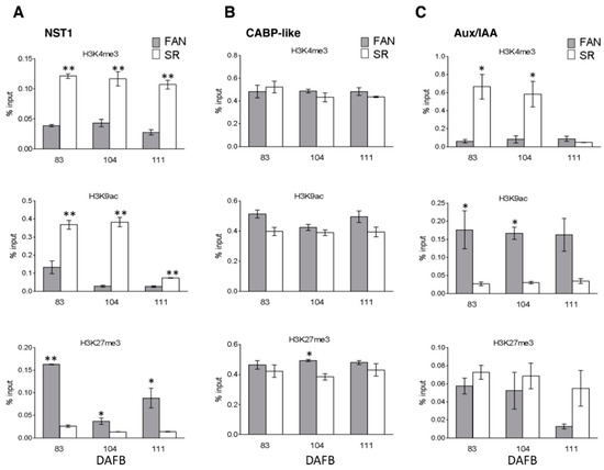 Chromatin mark analysis during the growth period of FANTASIA (FAN) and slow ripening (SR) genotype fruits, at target genes controlling fruit identity tissue and marking fruit development phases. Histone modification analysis at NST1 (Prupe.5G131900, Panel A), CABP-like (Prupe.5G117500, Panel B), and Aux/IAA (Prupe.8G232200, Panel C) loci by Real-time PCR quantification of ChIPed DNA immunoprecipitated with α-H3K4me3, α-H3K9ac and α-H3K27me3 antibodies on chromatin extracted from FAN (grey bars) and SR (white bars) mesocarp tissue at 83, 104, and 111 DAFB. Data are reported as percentage of chromatin input (normalized on background signal) measured by omitting antibody during ChIP procedure), and three PCR repetitions for each ChIP assay. Standard errors are reported. Asterisks indicate statistically significant changes: * = p ≤ 0.05, ** = p ≤ 0.01. DAFB: Days after full bloom.