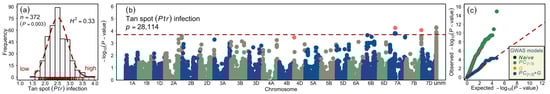 Phenotypic distribution and summary of the genome-wide association studies (GWAS) of tan spot infection in European winter wheat varieties. (a) Histogram of the square-root transformed tan spot Pyrenophora tritici-repentis (Ptr) infection scores on wheat varieties. (b) Manhattan plot showing the distribution of marker significance along the wheat chromosomes. The correction for population stratification was performed by using the first three principal components ( ) and an additive relationship matrix (G) in the linear mixed-effect model. The red dashed line marks the false discovery rate (FDR) threshold to detect marker-trait associations. (c) Quantile-quantile (qq) plot showing the distribution of observed versus expected (red dashed line) based on the naïve model (the general linear model without correction for population structure), model (the population structure corrected with first three PCs), the G model (population structure corrected with a genomic relationship matrix), and the model (population structure corrected with both PCs and the G matrix). The pink highlighted markers in the Manhattan plot designate the representative markers. The color code of different models is given in the figure legend. n = the number of varieties; p = significance value of the Shapiro–Wilk normality test; = broad-sense heritability; P = the number of quality marker loci; unm = the unmapped markers.