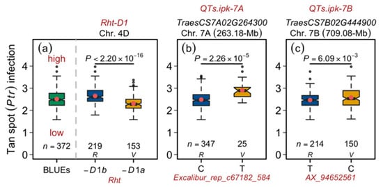 As observed in the phenotypic data analyses, a highly significant negative correlation of Ptr infection was observed with the plant height, suggesting that taller plants escape the disease infestation. Nevertheless, our GWAS—albeit setting a liberal MTA detection threshold (FDR) of 0.20—did not identify the Rht genes. The FDR value for Rht-D1 was, however, 0.25 and, therefore, being close to the threshold and frequent (Rht-D1a = 0.41; Rht-D1b = 0.59) in the European wheat germplasm, we investigated its genetic/allelic influence on the tan spot. The findings concurred with the phenotypic analyses where the impact of Rht-D1a (wild-type; tall allele) was significantly greater than Rht-D1b (dwarfing allele; short allele) in terms of reducing the Ptr infection (Figure 1b and Figure 2a). Similarly, allele-wise phenotypic distribution showed a significant difference between the varieties harboring the reference (major) and variant (minor) allele of the representative marker for the 7A-QTL QTs.ipk-7A (gene-ID = TraesCS7A02G264300; Table 2, Figure 2b). The same was true for another small- or medium-effect locus QTs.ipk-7B on chromosome 7B (gene-ID = TraesCS7B02G444900; Table 2; Figure 2c). Since the physical interval of the QTs.ipk-7A is large (~36-Mb), it is difficult to identify a single causative gene. Nevertheless, the large effect of 7A-QTL explaining >20% genotypic variance merits its future use for gene cloning and downstream molecular and functional analyses.