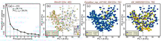 The extent of linkage disequilibrium (LD), the non-random association between different loci, plays a vital role in GWAS. The panel under investigation has been previously examined for the LD via different marker platforms [48,49]. In addition, the population structure and related parameters have been published earlier [49]. Here, to observe the alleles’ distribution in the investigated germplasm, we performed PC analyses based on singular value decomposition, as described previously [49]. The first ten PCs accounted for 29.2% of the total variation (Figure 3a). A two-dimensional scatterplot of the first two PCs for Rht-D1 alleles showed a clear distribution of both alleles on the opposite sides of the central axis (Figure 3b). However, the large-effect QTL on chromosome 7A (i.e., QTs.ipk-7A)—the minor allele of which was present in only 6.7% of the varieties—showed no clear pattern (Table 2; Figure 3c).