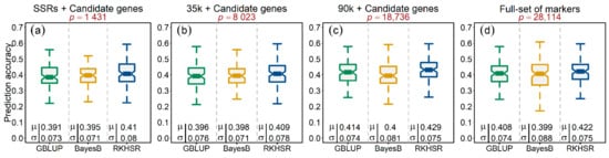 To observe the influence of individual marker platforms on the genome-wide prediction accuracies of Ptr infection, we tested three different models making different assumptions in this study, thus creating four scenarios as (1) SSR alleles, (2) 35k SNP array, (3) 90k SNP array, and (4) the full set of markers altogether. In every scenario, we incorporated the functional candidate-gene markers as well. The mean prediction accuracies resulting from the five-fold cross-validation scenario of Ptr infection generally produced similar results (~40%) across all three tested model scenarios, i.e., the GBLUP model that accounted for the main additive effects of markers assuming equal variances, BayesB by assuming unequal marker variances, and RKHSR that accounted for both additive and the epistatic interactions among the loci (Figure 4a–d). Overall, the 90k platform outperformed every other scenario with higher (1–2%) prediction accuracies. The RKHSR resulted in relatively better prediction accuracy than the GBLUP and BayesB, suggesting—albeit not highly prevalent—the presence of epistatic interactions for the Ptr infection.