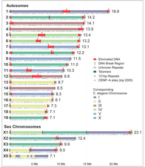 The germline and somatic assemblies were further improved with new technologies, including long reads, optical mapping, and Hi-C, to produce two major recent updates (Table S1) [38,39]. The latest Ascaris germline and somatic genomes represent fully assembled chromosomes [39], with 24 germline chromosomes and 36 in somatic cells; all repetitive sequences were anchored in these assembled chromosomes (Figure 1).