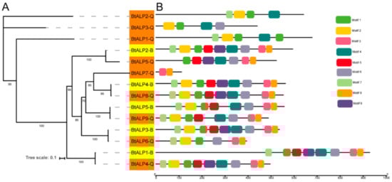 Figure 2. Phylogenetic relationships and protein motif analysis of B. tabaci MEAM1 and MED. (A)—the maximum-likelihood phylogenetic tree generated by IQ-tree and the bootstrap test was performed with 1000 replicates. Yellow shading marks ALPs in B. tabaci MEAM1. Orange shading marks ALPs in B. tabaci MED. (B)—all motifs were identified by the MEME database with the complete amino acid sequences of ALPs, and are presented in Supplementary Figure S1.