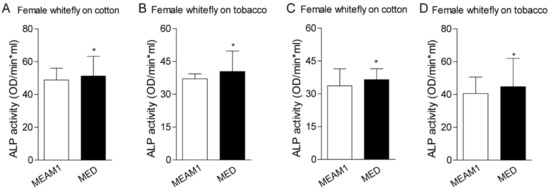 Figure 4. ALP activity analysis in whiteflies fed on cotton and tobacco. Each dot represents one female/male whitefly ALP activity. (A,B)—female whitefly on the cotton and tobacco from MEAM1 and MED whiteflies; (C,D)—male whitefly on the cotton and tobacco from MEAM1 and MED whiteflies. * indicates p < 0.05.