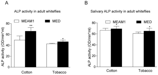 To investigate the direct role of host plants on whiteflies’ ALP activity, we examined the enzyme activity according to the previous description [24]. Whiteflies fed on cotton have higher ALPs activity than those fed on tobacco, regardless of the gender of MEAM1 and MED whiteflies. MED whiteflies presented higher ALP activity than MEAM1 whiteflies, both in the female and male (Figure 4). A previous study also indicated whitefly saliva contained ALP activity, and ALP aids whiteflies feeding on different host plants [23,24]. We further compared the ALP activity in whiteflies’ saliva with whole insects. MED whiteflies presented higher ALP activity than MEAM1 whiteflies, no matter whether in the saliva or whole insects. In addition, whiteflies fed on cotton have higher ALP activity in the saliva as well (Figure 5). These results strongly suggested that MED has increased ALP activity relative to MEAM1, consistent with the identified divergent family members of ALP proteins in the MED whitefly genome.