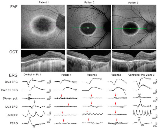 FAF, OCT, and ERG of the three studied patients. Note that although the brothers (Patients 2 and 3) had similar FAF and OCT phenotypes, Patient 2 had better LA ERG and residual PERG response coinciding with better visual acuity.