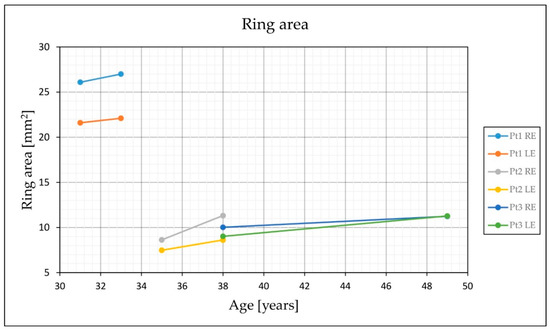 Enlargement of the hyperautofluorescent ring area with time. Enlargement of the hyperautofluorescent ring was observed in all patients (see also Figure 1). Ring area has been observed and measured between first and last examinations in all patients. Exact measurements are given in Table 1.