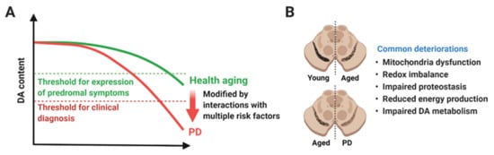 A hypothetical model of aging and Parkinson’s disease (PD). (A) Functional DA neurons are reduced in both healthy aging and PD. Rate of degeneration in healthy aging and PD might be similar up to a certain time point or age, but degeneration in PD is accelerated until reaching the threshold for clinical diagnosis (red dotted line). The upper green dotted line represents the threshold for expression of prodromal symptoms. Several genetic and environmental risk factors might play a role in accelerating degeneration of DA neurons and causing PD. (B) Degeneration of DA neurons in the SN is considered as the pathological hallmark of PD, but it also occurs in healthy aging. The difference in healthy aging and PD might be the quantity of neurodegeneration rather than the quality. Healthy aging and PD share a plethora of cellular dysfunctions, such as mitochondrial dysfunction, redox imbalance, impaired proteostasis, reduced energy production, and impaired DA metabolism. Created with BioRender.com.