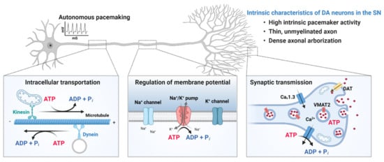 Intrinsic properties of dopaminergic (DA) neurons in the substantia nigra (SN). The nigrostriatal DA neurons are autonomous pacemakers, and their tonic spontaneous activity is important for the sustained release of dopamine in target structures, such as the striatum. In addition, DA neurons in the SN have thin, unmyelinated axons with an extraordinary large axonal arbor and a very high number of synaptic terminals. The size and complexity of DA neurons in the SN impose a high metabolic burden to produce ATP, which is required for transporting cellular components to appropriate locations, maintaining resting membrane potential, generating and propagating action potential, and regulating synaptic transmission. Metabolically active DA neurons in the SN are susceptible to mitochondrial dysfunction, which is a prominent feature of both aging and PD. Created with BioRender.com.