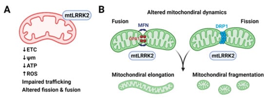 Mitochondrial dysfunction caused by pathogenic LRRK2 mutants. (A) Pathogenic LRRK2 mutants (mtLRRK2) reduce the activity of electron transfer chain (ETC) reaction and mitochondria membrane potential (ψm), resulting in inefficient ATP production and increased reactive oxygen species (ROS) production. (B) Pathogenic LRRK2 mutants interact with mitochondria fusion proteins, such as mitofusin (MFN) and optic atrophy protein 1 (OPA1) and mitochondria fission proteins, such as dynamin-related protein 1 (DRP1). Pathogenic LRRK2 mutants alter mitochondrial morphology and dynamics presumably by interacting with the fusion and fission machinery but the exact molecular mechanism awaits to be elucidated. Created with BioRender.com (accessed on 13 February 2021).
