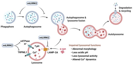 Macroautophagy, chaperone-mediated autophagy (CMA), and microautophagy are the three major forms of autophagy identified so far [147]. Macroautophagy starts with the formation of a cup-shaped membrane, phagophore that elongates and sequesters a portion to the cytoplasm to form the autophagosome. The autophagosome then fuses with the lysosome to form the autophagolysosome where the contents are degraded. In CMA, proteins are targeted to lysosomes by a chaperone through the interaction between the chaperone and a pentapeptide present in the substrate. Substrate proteins then bind to a transmembrane receptor, lysosome-associated membrane protein type 2A (LAMP-2A), which multimerizes to form the translocation complex that carries the substrate proteins into the lysosome for degradation. In microautophagy, cytoplasmic contents are directly engulfed into lysosomes for degradation. Central to all three forms of autophagy is the lysosome. Lysosome function decreases with age, with a rise in lysosomal pH [148]. A role of lysosomes in PD pathology is reflected in the PD-associated genes involved in lysosomal function, such as VPS35, ATP13A2 and GBA [6,149].