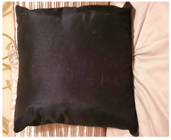 Dogs and cats are two pet species that are commonly in close contact with humans. According to the North American Pet Insurance Association (NAPHIA), 65% of households in the USA, or 85 million homes, have a dog (https://www.iii.org/fact-statistic/facts-statistics-pet-statistics (accessed on 12 March 2021)). Equally over 9 million dogs and 8 million cats are owned in the UK (according to statista.com), this is about 25% of all homes. It is not surprising therefore that hairs from either dogs or cats are found associated with forensic evidence such as clothing, car seats, and household soft furnishing, an example is shown in Figure 1.