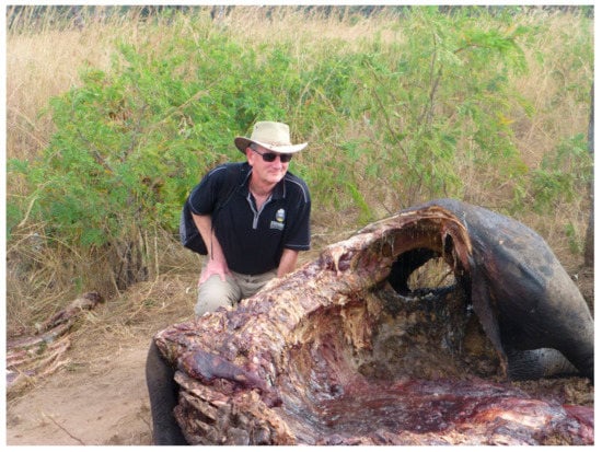 RhODIS® is a comparable system for the linkage of rhino horns to that of elephants [15]. The RhODIS® test is promoted by the University of Pretoria and is comprised of 12 STR loci plus a gender test. It was developed for the two species of rhino that still live in Africa: the white rhino (Ceratotherium simum) and the black rhino (Diceros bicornis). A potential for RhODIS® is that samples from members of the last remaining white and black rhino in wildlife parks such as Kruger can be collected and then later matched to seized horns taken from poached rhino. The author of this review was a guest of a World Bank and TRAFFIC supported visit to Kruger national park in eastern South Africa to witness RhODIS® in action. Figure 2 is an image of the author attending the poaching of a mother rhino, nearby was the corpse of the offspring; both killed for their horns.