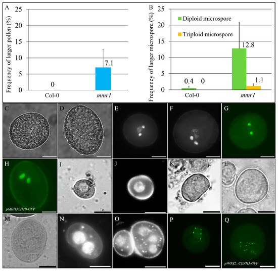 Previously, we screened an M2 Col-0 Arabidopsis EMS-mutagenized population for mutants that produce pollen grains with enlarged sizes. In this screen, we identified the male meiotic restitution 1 (mmr1) that produces approximately 7.1% over-sized pollen grains (Figure 1A,C, Col-0 and D, mmr1). 4′,6-diamidino-2-phenylindole (DAPI) staining revealed that the enlarged pollen contained larger sperms indicative of a higher DNA content (Figure 1E, Col-0; F, mmr1; Supplementary Figure S1A–C). In support, mmr1 plants expressing pMGH3::H2B-GFP that labels sperm nuclei [46] exhibited larger H2B fluorescent signals (Figure 1G, Col-0; H, mmr1; Supplementary Figure S1D–F). Occasionally, the enlarged mmr1 pollen grains were found to contain more than two sperm (Supplementary Figure S1C,F), indicating a potential defect in cell division or chromosome dynamics. Unicellular stage microspores were next examined, which showed that mmr1 generated larger microspores with multiple nuclei (Figure 1I,J, Col-0; K–O, mmr1), suggesting that the enlarged pollen grains originated from the over-sized microspores. We then introduced pWOX2::CENH3-GFP into the mmr1 mutant to determine the exact chromosome number of the enlarged gametes [43]. Most unicellular stage microspores from wild-type showed five CENH3 foci, which represent halved chromosome counts (Figure 1B,P). In contrast, the enlarged mmr1 microspores contained either 10 (12.8%) or 15 (1.1%) CENH3 foci (Figure 1B,Q; Supplementary Figure S2A,B), indicating these over-sized microspores were diploid and/or triploid, respectively. Meanwhile, the mmr1 mutant showed normal silique development (Supplementary Figure S3A,B) but yielded less seeds than wild-type plants (Supplementary Figure S3C). These findings suggest that mmr1 produces unreduced gametes and has an interfered fertility.