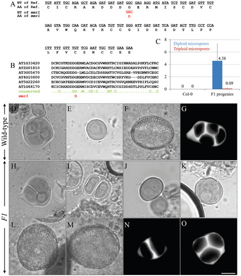 mmr1 is an allelic mutant of MMD1/DUET. (A) Figure showing the nucleotide (NT) sequence and amino acid sequence of the PHD domain in the MMD1/DUET gene and protein, and the changes of that in mmr1. (B) Figure showing the conservation of the amino acid in the PHD domain in multiple histone binding proteins, and the point mutation-caused amino acid replacement in that of mmr1. (C) Histogram showing the frequency of diploid and triploid microspores produced by mmr1/mmd1 F1 progenies. Nine individuals were quantified. Numbers indicate the frequency of diploid and/or triploid microspores. (D,H,I) Orcein-stained tetrads in the Col-0 plants (D), and triad (H) and dyad (I) in the mmr1/mmd1 F1 progenies. (E,J,K) Haploid unicellular stage microspore in the Col-0 plants (E), and diploid (J) and polyploid (K) unicellular-stage microspores in the mmr1/mmd1 F1 progenies. (F,L,M) Haploid pollen grain in the Col-0 plants (F), and enlarged pollen grains in the mmr1/mmd1 F1 progenies (L,M). (G,N,O) Aniline blue-stained meiotic cell walls in the Col-0 plants (G) and in the mmr1/mmd1 F1 progenies (N,O). Scale bar = 10 µm.