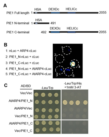 The association of ARP4 and SWR1 complex has been widely studied in different organisms. In yeast and human systems, ARP4 is shared by several complexes such as INO80 and SWI/SNF (BAF) [18]. Then, using Arabidopsis AtARP4 as the protein bait, it was found that all conserved subunits of the SWR1 complex were associated with AtARP4 [27]. In addition, co-immunoprecipitation analysis of plants expressing a PIE1-3xFLAG-3xHA fusion protein found that AtARP4 could be detected in the IP products of PIE1 [28]. These results suggest that AtARP4 and PIE1 are associated with each other in Arabidopsis. In order to detect whether there is a direct physical interaction between AtARP4 and PIE1, we performed a LCI assay in tobacco leaves. Two truncation forms of PIE1 N-terminal with 1–491 amino acid residues and PIE1 C-terminal with 492-2055 amino acid residues were generated (Figure 2A). We found that AtARP4 could interact with the N-terminal region of PIE1, but not the C-terminal region of PIE1 (Figure 2B). Then, yeast two-hybrid assays were further carried out (Figure 2C). Yeast cells expressing AtARP4 and PIE1-N terminal fragment were able to grow on media deficient in leucine, tryptophan, and histidine, indicating that N-terminal region of PIE1 could directly interact with AtARP4 (Figure 2C). Combined with these results, it confirmed that AtARP4 physically interacted with PIE1 in the SWR1 complex in Arabidopsis.