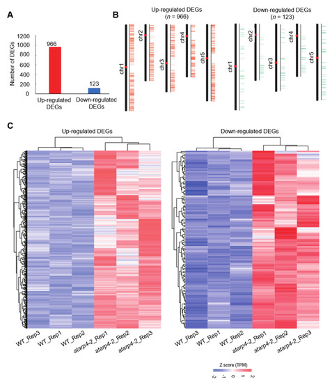 PIE1 has been identified as the scaffold of the SWR1 complex that can promote the deposition of H2A.Z at the whole genome-wide level [28]. Although the SWR1 chromatin remodeling complex is critical to eukaryotic gene expression regulation [29], subunits of this complex such as PIE1, ARP6 and SWC6 as well as H2A.Z are found to play distinctive roles in this process [30]. To elucidate how genes are regulated by AtARP4, global transcriptomic analyses on mRNA isolated from 14-day-old seedlings of WT and atarp4-2 plants were carried out. The sequencing quality for all samples was examined, and for both WT and atarp4-2 mutant, the principal component analysis (PCA) showed reliable consistency among the biological triplicates (Figure S2A). Additionally, for each genotype, the Pearson correlation between every two biological replicates was more than 94%, further indicating these biological replicates were highly consistent (Figure S2B). A closer analysis of DEGs in atarp4-2 mutant compared with WT under non-limiting conditions revealed that the mutation of AtARP4 resulted in remarkable transcriptional changes, among which 966 genes were up-regulated and 123 genes were down-regulated (Figure 3A and Table S2). The number of induced genes was significantly higher than that of down-regulated DEGs by ~7-fold, indicating that AtARP4 may be involved in control of biological processes through negative regulation of expression of related genes. Furthermore, it is interesting to note that most DEGs were distributed on the chromosomes and were far from the centromeric regions (Figure 3B). In addition, heatmaps for both up-regulated and down-regulated DEGs in atarp4-2 mutant were generated based on the trans per million (TPM) value. It could be clearly seen that the range of alteration in expression levels of down-regulated DEGs was much larger than that of up-regulated DEGs (Figure 3C).