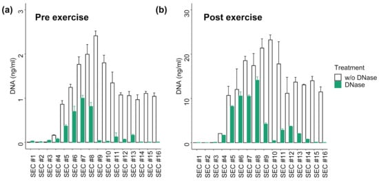 Distribution of DNA in SEC fractions with or without DNase I digestion of (a) Pre exercise plasma sample and (b) Post exercise sample. The DNA concentration was measured with qPCR without prior DNA isolation. The error bars represent SD of three technical qPCR replicates. Post exercise values show ~10-fold higher DNA concentrations.