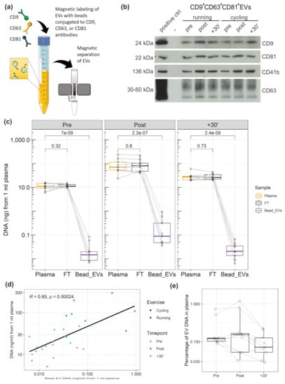 Since EV preparation by SEC is highly susceptible to co-isolate large lipoproteins, which are associated with extracellular plasma DNA [], we decided to further study the association of DNA with EVs prepared by immuno-affinity capture, which shows higher purity. Figure 3a illustrates capture and magnetic separation of CD9+/CD63+/CD81+EVs from plasma. WB analysis confirmed the abundance of EV markers (a representative WB is presented in Figure 3b). Figure 3c displays the amount of DNA in 1 ml of plasma, 1 ml of flow through (FT), or CD9+/CD63+/CD81+EVs corresponding to 1 ml of plasma. The samples were taken Pre, Post, and 30´ after exercise, from n = 5 subjects who performed two repeated exercise tests. Multiple comparison t tests did not show significant differences between plasma cfDNA and FT cfDNA in any of the time points (P values without adjustment for multiple comparisons are presented, see Figure 3c). Figure 3e shows the percentage of EV-associated DNA with the total amount of plasma DNA. Overall, 0.12 ± 0.05 % (median ± SEM) of the total plasma DNA is associated with CD9+/CD63+/CD81+EVs. Specifically, 0.12 ± 0.08 % in the Pre samples, 0.15 ± 0.14 % in the Post, and 0.07 ± 0.02 % in the +30’ samples. The significant and strong correlation between plasma and CD9+/CD63+/CD81+EV cfDNA values (Figure 3d) indicates that a higher amount of DNA occurs in association with EVs if plasma cfDNA levels are higher.