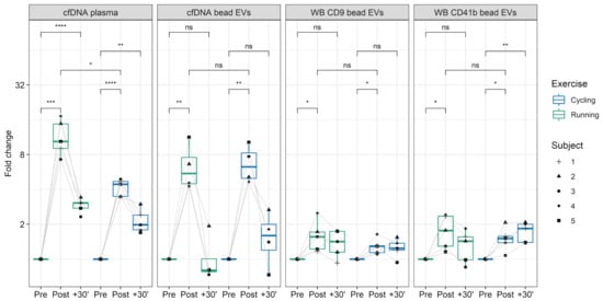 cfDNA and CD9+/CD63+/CD81+EVs kinetics in running versus cycling. The fold-changes of plasma cfDNA and CD9+/CD63+/CD81+EVs DNA, detected with qPCR, and fold changes of CD9+/CD63+/CD81+EVs, represented by CD9 and CD41b Western blot analysis, in running and cycling exercise are illustrated. The labels represent selected comparisons between time points and exercise modalities, reflecting unadjusted p-values (* = p < 0.05, ** = p < 0.01, *** = p < 0.001, **** = p < 0.0001). ns: not significant.
