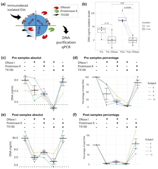 To study the proportion of DNA which is associated with the EV surface or protected within the lumen of EVs, CD9+/CD63+/CD81+EVs were treated as illustrated in Figure 5a, with or without DNase, and, in combination with protease or TX100. Subsequently, the DNA was isolated using an isolation kit. DNase treatment should reduce the major part of DNA on the surface of EVs; however, a more efficient degradation could be reached in the presence of proteases that hydrolyse DNA-bound proteins []. A first comparison of DNase treated or untreated Pre and Post samples (Figure 5b) shows that the total amount of DNA increases significantly from Pre 9.51 (±2.69) ng/mL to Post 77.37 (±37.41) ng/mL (mean ± SEM). Notably, the DNase treated Pre and Post values do not differ significantly, showing similar DNA concentrations with Pre 3.61 (±4.28) and Post 2.26 (±1.50) ng/mL. This indicates that the cfDNA, which increased in response to exercise, is associated with the surface of EVs, susceptible for DNase digestion. As shown in Figure 5c,d, the DNase treatment reduced the amount of DNA in the Pre exercise samples from 9.51 (±5.39) ng/mL (100%) to 3.60 (±2.14) ng/mL (43.88%). DNase and protease reduced the concentration to 1.50 (±0.39) ng/mL (20.11%). TX100 and DNase treatment enabled the digestion of almost all DNA, reducing the value to 0.23 (±0.02) ng/ml. The results indicates that ~20% of the EV associated DNA are within the lumen of the EVs. The treatment with TX100 and protease without DNase showed similar results, compared to the untreated condition (7.85 ± 2.29 ng/mL, equaling 84.5%). In the Post samples (Figure 5e,f) the DNase digest showed that almost all DNA is sensitive to DNase digestion, reducing the DNA concentration down to 4.47% of the total EV associated DNA. Notably, in the Post samples the treatment condition protease with DNase showed slightly higher values than DNase alone (4.97 ± 1.12 and 2.26 ± 0.75 ng/mL, respectively). Additionally, in the TX100 and DNase treated samples remaining DNA was detected (3.27 ± 1.91 ng/mL), which might indicate that the DNase treatment did not work efficiently in the Post samples, which have about 8-fold higher DNA values compared to the Pre samples.