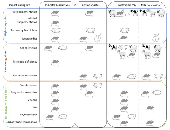 It is now fully recognized that among environmental factors that play a significant role in MG development and subsequent lactation, nutrition and, more specifically, diet composition are of utmost importance. Indeed, changes in energy intake and/or diet composition affect multiple aspects of MG function, as demonstrated by modifications of milk secretion and composition, changes in MG gene expression at a transcriptional level in part linked to cellular growth and proliferation, as well as the remodeling of mammary cells and alterations of MG protein expression. The variations in feeding components and challenges as well as the techniques used to assess diet-induced outcomes undoubtedly contribute to understanding the variety of phenotypes reported in this review. Knowledge from three species, frequently used as models for mammary biology investigations, clearly demonstrates the importance of critical physiological stages, such as puberty, gestation, and early lactation, in the nutritional regulation of mammary development, insofar as it is tightly dependent on hormonal cross-talks. Similarly, studies on lactating model animals as well as on dairy livestock animals, regarding their similarities or differences in response to nutritional challenges, allow to assess not only the total energetic value of the diet but also the relative importance of the various dietary nutrients, in particular their dose-dependent effects as well as their interactions in the ration.
