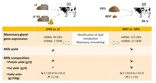Effects of sunflower supplementation and restricted diet on milk and mammary gene expression. Reprinted with permission from ref. [1] Copyright 2019 Cambridge Core; Reprinted with permission from ref. [2] Copyright 2021 MDPI. CTRL: control diet; DEG: differentially expressed mRNA; DEM: differentially expressed microRNA; EB: energy balance; LF: low forage; LFSO: low forage with 4% of sunflower oil; REST: restricted diet to covered 50% net energy for lactation.