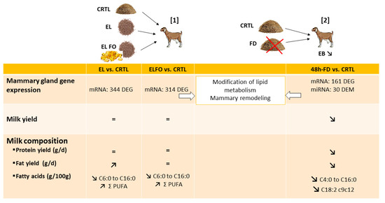 Effects of extruded linseeds (EL) alone or in combination with fish oil (ELFO) supplementation and of 48-h feed restriction (REST) in lactating goats on milk and mammary gene expression. Reprinted with permission from ref. [1] Copyright 2019 Cambridge Core; Reprinted with permission from ref. [2] Copyright 2021 MDPI. CTRL: control diet; DEG: differentially expressed mRNA; DEM: differentially expressed microRNA; EB: energy balance.