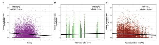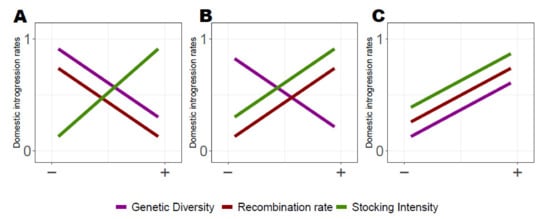 Predicted relationships between domestic ancestry rate, local recombination rate, local genetic diversity and stocking intensity. (A) Predicted relationship expected with associative overdominance (AOD), where more domestic ancestry are observed in low-diversity genomic region by masking the effects of potentially recessive deleterious mutation []. (B,C) Predicted relationship with negative epistasis where loci of incompatibility results in lower domestic ancestry in low recombining genomic regions. (B) Predicted relationship in presence of potential local beneficial alleles where lower diversity is expected due to the fixation of the beneficial alleles and higher introgression of domestic ancestry. (C) Predicted higher domestic ancestry in low-diversity genomic regions, namely due to the purge of incompatibility alleles [,]. X-axis illustrates the range of variation for each of the three variables (i.e., from lower to higher).