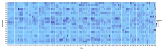Heatmap of the proportion of domestic ancestry rate along the 42 Brook Charr linkage groups (LGs) for each lake. Lakes are ordered as a function of stocking intensity (less stocked lakes at the bottom). Labels are detailed in Table 1.